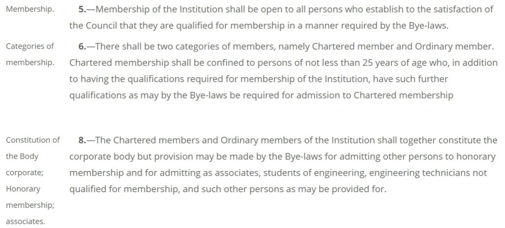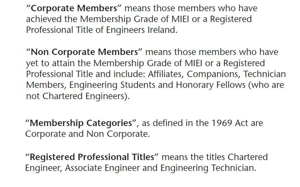 Clarity is provided by the definitions in the Engineers Ireland Bye-laws(2012) regarding the types of members that make up the two categories referred to in the Charter Amendment Act(1969). They are as follows: