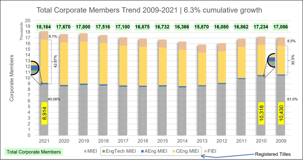 - The most revealing metric is however, the decline in the number of Ordinary Members (MIEI) over this period. In 2009 there were 10,430 Ordinary Members, (61% of the corporate membership). By 2021, the number of Ordinary Members dropped to 8,914 (49.1% of Corporate Members). The awarding of Registered Titles to Ordinary Members would account for a some of the shift in the make-up of the Corporate Members as highlighted above.