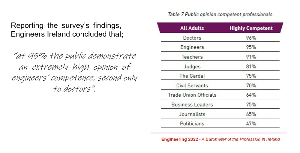 Reported in Engineering 2018 – A Barometer of the Profession in Ireland the “first question put to the public”, “sought to benchmark the levels of trust placed in engineers against trust in other professional groups. This built on research carried out by the Medical Council of Ireland’s ‘Survey of Public Attitudes to Doctor’s Professionalism’ whose methodology” Engineers Ireland “replicated”. The former Director General (2015-2022) in its Foreword maintained that “this report demonstrates the exceptionally high levels of trust in engineers, who are regarded as highly competent professionals.”